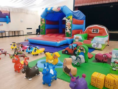 Our Big Farm setup includes the Farmyard Animal Themed soft play and ball pond with a toddler bouncy castle!